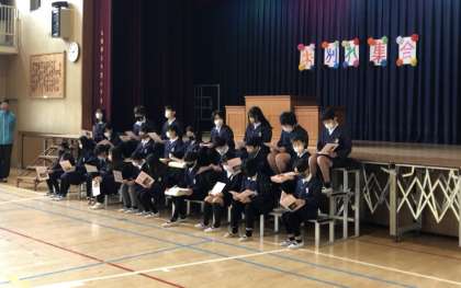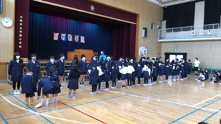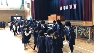一年生から六年生へたてわり班のみんなで作ったメッセージカードを渡しました。