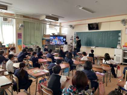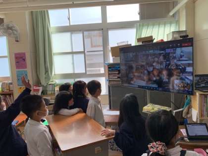 休み時間、画面に東中本小学校が映った瞬間、保育園・幼稚園の頃の友だちがいたようで、大喜びで手を振っていました。