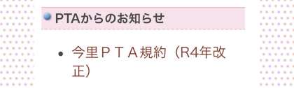 学校ホームページの右欄【配付文書】のPTAからのお知らせに、「今里PTA規約(R4年改正)」をアップしています。