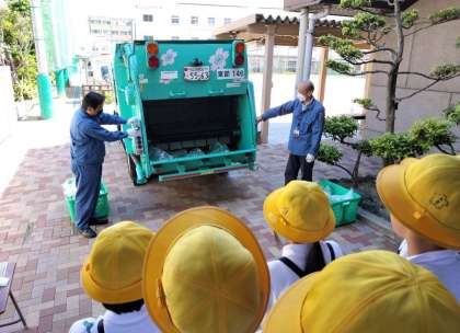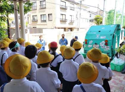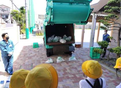 1時間目は、パッカー車について学びました。実際にごみ袋を積み込む様子を見学しました。