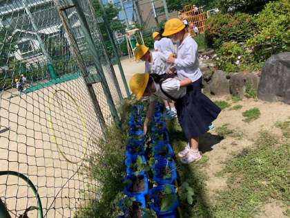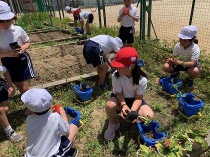 自分で選んだ苗を観察し、植えました。ナス、ミニトマト、キュウリ、枝豆、オクラです。