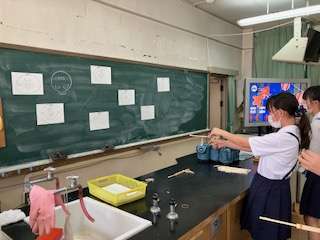 割りばしと輪ゴムを使って、割りばしでっぽうを作りました。手作りの的を狙って輪ゴムを発射します。