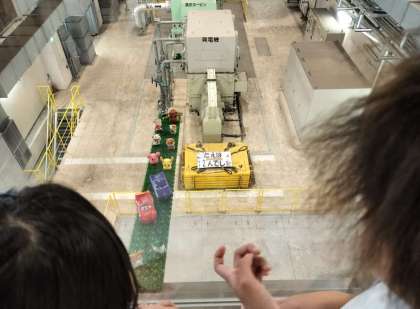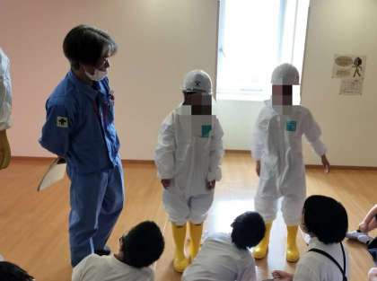 職員さんが着ている防護服の体験がありました。想像以上に生地がしっかりしていました。