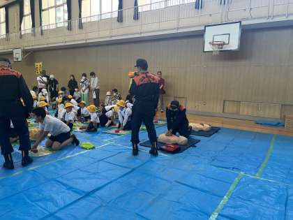 今日は、4年ぶりに、地域と学校の合同防災訓練を実施しました。町会のグループで、「煙体験、水消化器、