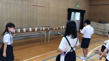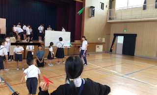 一人一回紙飛行機をとばし、そのきょりをきそいます。