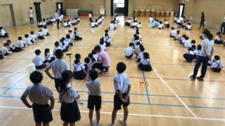 前のリーダーから背中にひらがなで一文字書いていきます。