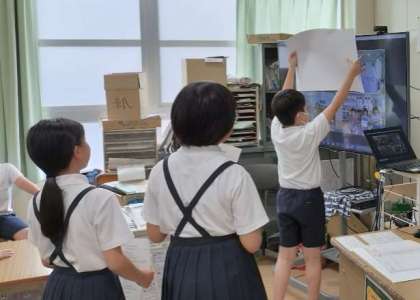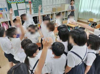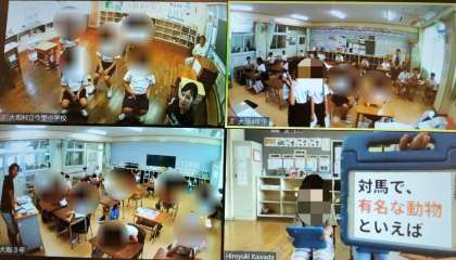 交流内容は「かぶっていいよ」で、出されたお題に対して、4つのクラスの回答が重なるように合わせるゲームでした。