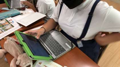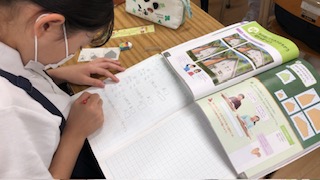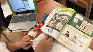 マスの数をかぞえたり、タブレットに写した図形をずらして比べたりして調べてみました。