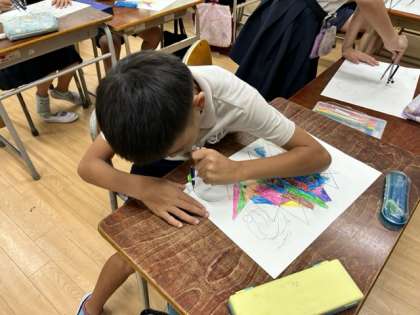 図画工作科では、図形と図形の重ねてできた気に入った形に色を塗る活動をしました。