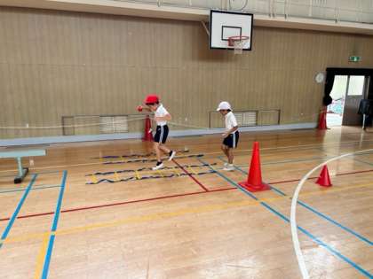 最後の障害物リレーでは、ケンケンや平均台、両足ジャンプをして、走るだけでなく色々な動きも取り入れました。