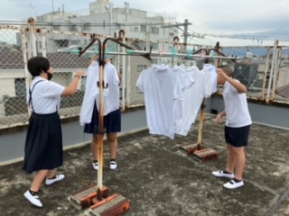 洗った後は、脱水し、屋上に干しました。