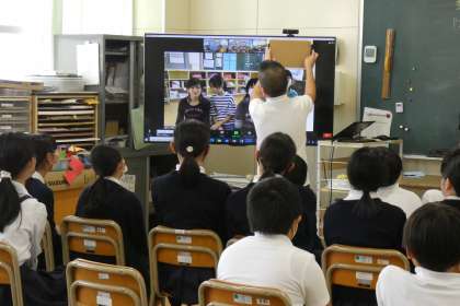 対馬、大和村、大阪の5年、大阪の6年のチームが、それぞれの答えを話し合い、ホワイトボードに書いて紹介しあいました。