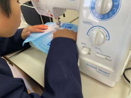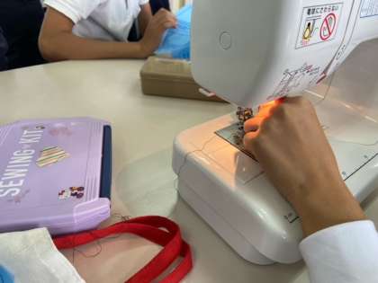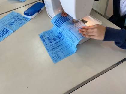 ミシンで縫うことに挑戦しています。見本通り真っ直ぐ縫うことができています
