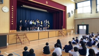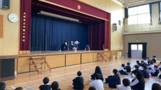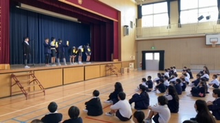 児童会のメンバーが、今里小のみんなが廊下や階段でケガをしないようにと劇で伝えました。