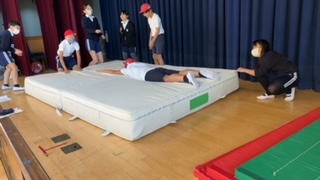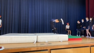 後転倒立、頭ハネとび、とびこみ前転、ハンドスプリングの練習をしました。