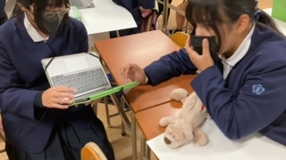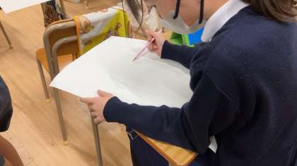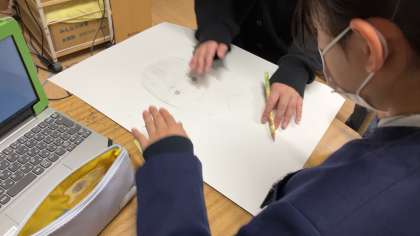 タブレットで自分の顔を写し、それをじっと見ながら画用紙に下書きしました。