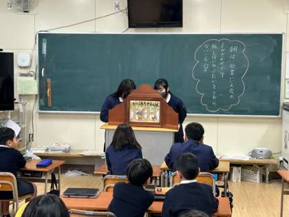 朝の時間に図書委員会の6年生が紙芝居を演じに来てくれました。