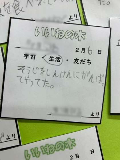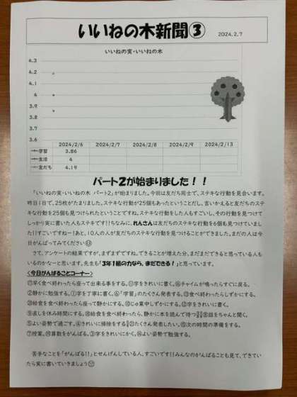 ステキな行動を認め合って、よりよい学級にしていくことがめあてですが、新しい友だちの良さも発見して欲しいと思っています。