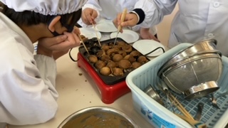 たこ焼き機を使ってチョコやりんごなどを入れて焼く。