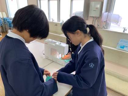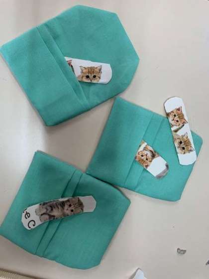 みんな猫が好きなようで、端切れの猫の部分をどう入れるか一生懸命考えて作っていました。ケースはミシンで縫いました。曲線の部分に苦戦していましたが、縫った後にひっくり返すとケースになり、歓声が上がっていました。