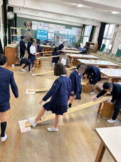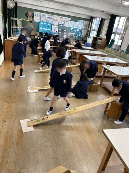 参観で見ていただいた図画工作科の作品で遊び、良かったところや楽しかったところを伝え合いました。