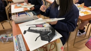 教室の黒板、講堂でのマット、跳び箱、バスケットゴール、音楽室のピアノ、家庭科室、渡り廊下、正門、運動場、、、