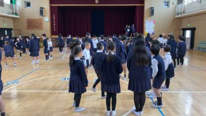 六年生の卒業を全校児童でお祝いし、感謝の気持ちをゲームや歌で表しました。