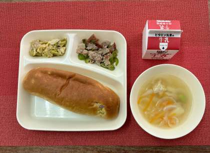 今日の献立は、豚肉のガーリック焼き・スープ・ツナとキャベツのソテー・おさつパン・牛乳でした。