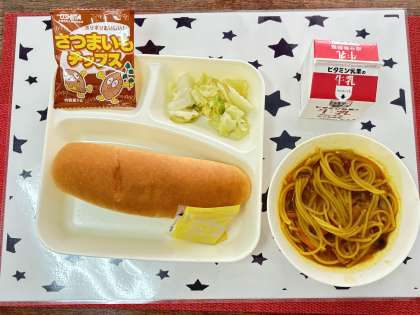 今日の献立は、カレースープスパゲッティ・キャベツのピクルス・おさつチップス・コッペパン・アプリコットジャム・牛乳でした。