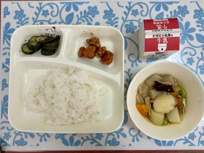 今日の献立は、まぐろのオーロラ煮・豚肉とじゃがいもの煮もの・きゅうりの赤じそあえ・ごはん・牛乳です。