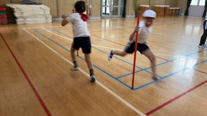 ぼうバランス。合図でぼうから離れてとなりに移動します。タイミングが合うと成功します。