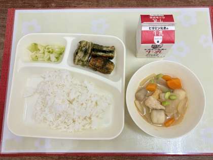 今日の献立は、ちくわのいそべあげ・あつあげとさといものみそ煮・あっさりキャベツ・ごはん・牛乳です。