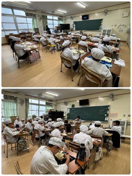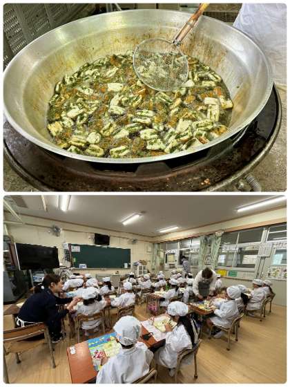ちくわのいそべあげは、青のりと小麦粉でつくった衣をつけたちくわをカラッと揚げたボリューム満点の1品でした。モチモチした食感で食べ応えがあり、好評でした。