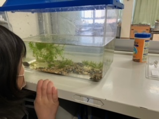 いつも生き物係りがお世話をしているメダカにたまごがついていました。