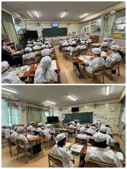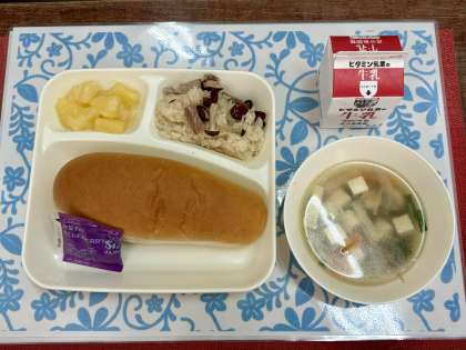 今日の献立は、金時豆の中華おこわ・中華スープ・パインアップル(カット缶)・コッペパン・ブルーベリージャム・牛乳です。
