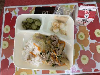今日の献立は、「豚丼」「きゅうりの梅風味」「白玉だんご(きな粉)」でした。