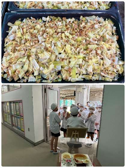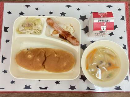 今日の献立は、ウインナーのケチャップソース・スープ・焼きツナキャベツ・おさつパン・牛乳です。