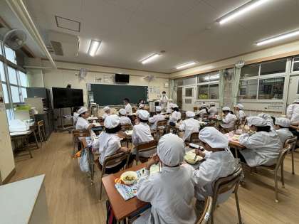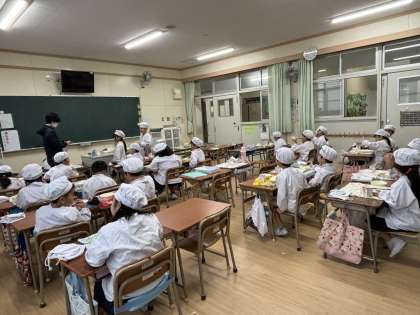 今日の献立は、きびなごてんぷら・みそ汁・わかたけ煮・ごはん・牛乳です。
