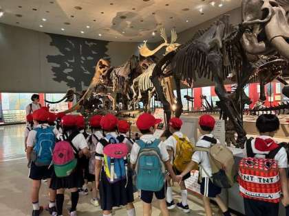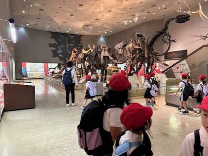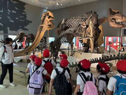 トリケラトプスの顔が子どもたちの体より大きいです。