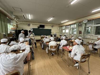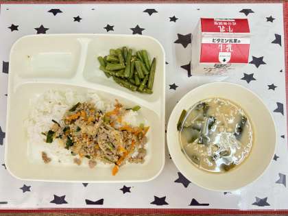 豚ひき肉とにらのそぼろ丼は、しょうがとにんにくがよくきいたボリューム満点の丼でした。甘辛い味付けで、ごはんが進みおかわりをする児童が多くいました。