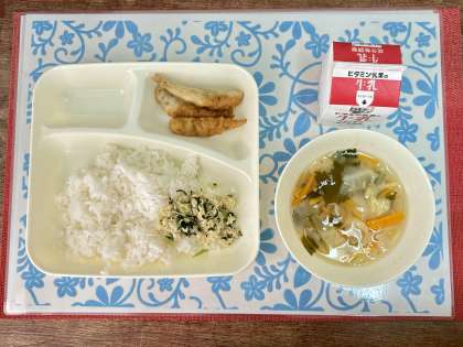今日の献立は、いわしてんぷら・五目汁・とりなっ葉いため・ごはん・牛乳です。