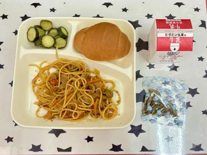 今日の献立は、カレースパゲッティ・きゅうりのピクルス・ミニフィッシュ・ミニコッペパン・牛乳です。