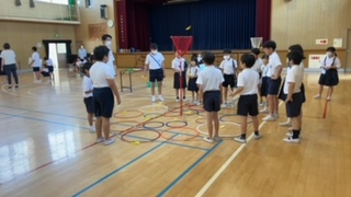 折り紙の飛行機を飛ばして玉入れのかごに入れば10点です。下の丸に入っても点が入ります。