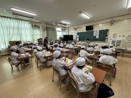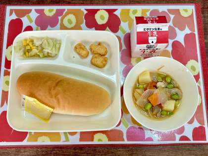 今日の献立は、いかてんぷら・フレッシュトマトのスープ煮・キャベツとコーンのサラダ・コッペパン・アプリコットジャム・牛乳です。