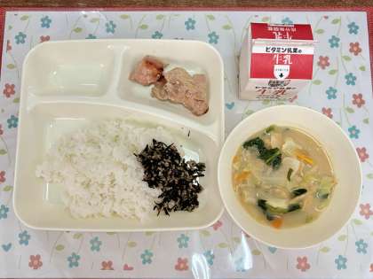 今日の献立は、鶏肉の照り焼き・みそ汁・魚ひじきそぼろ・ごはん・牛乳です。