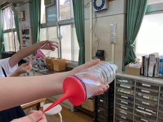 今日は、科学クラブで、ペットボトル空気砲を作りました。