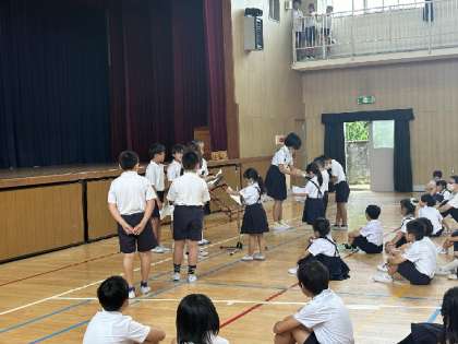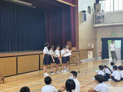 今日の朝の児童朝会では、6月の食育月間の取り組みであった給食当番の身支度チェックの表彰式を行いました。