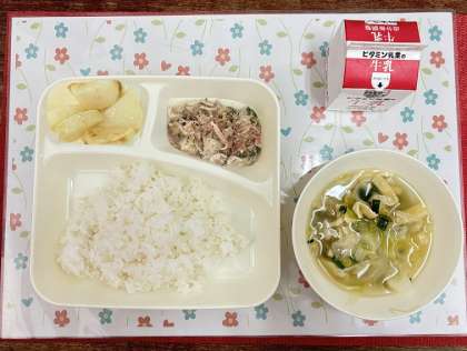 今日の献立は、ゴーヤチャンプルー・五目汁・あげ焼きじゃが・ごはん・牛乳です。