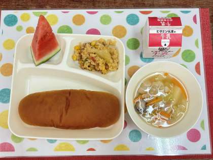今日の献立は、パエリア・ウインナーとキャベツのスープ・すいか・黒糖パン・牛乳です。