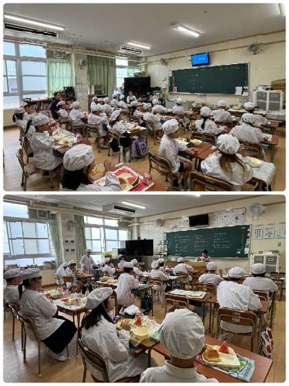 すいかは、鳥取県産のすいかでよく熟れていて大好評でした。大阪市の給食では、1玉のすいかから64人分を切って提供しています。